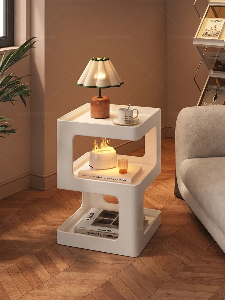 クリーミーな風合いのソファサイドテーブル|軽やかで高級感あるデザイン|移動可能なティーテーブル|2024年新モデル|ベッドサイド収納ラックとしても使えるサイドキャビネット