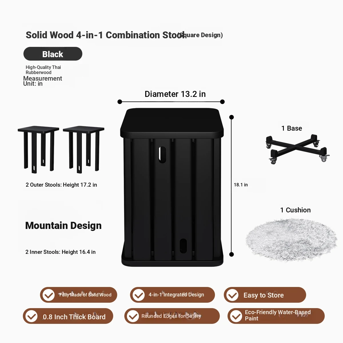 Square stool-with pulley base-Retro black-[all solid wood-self-contained delivery] to send thickened carpet