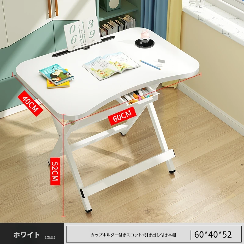 【テーブルと椅子のセット】ナチュラルホワイト60*40*52(スロットカップホルダー+引き出し本棚)スツール高さ30cm