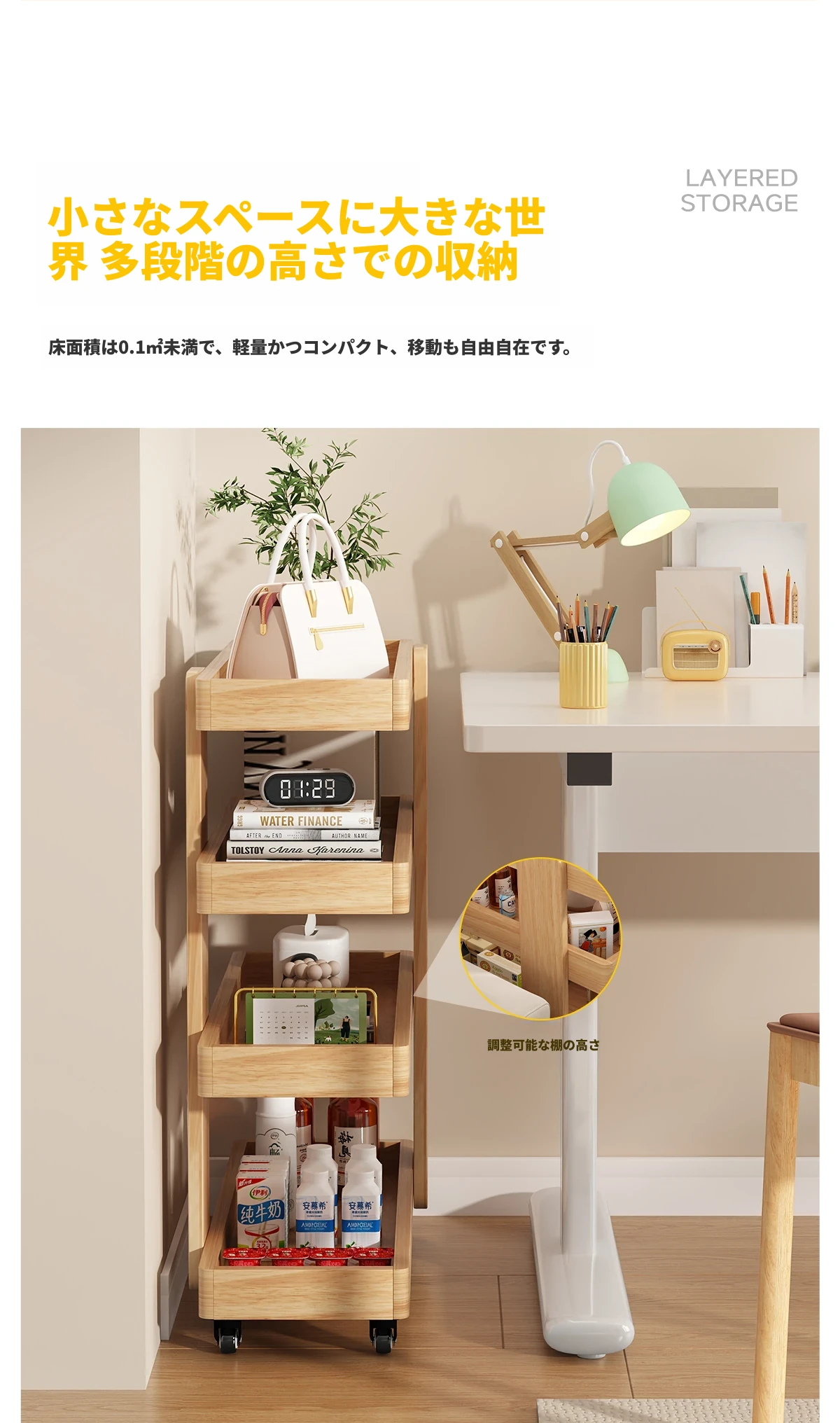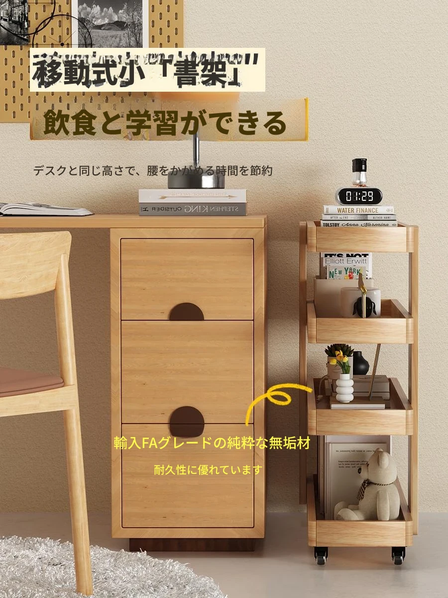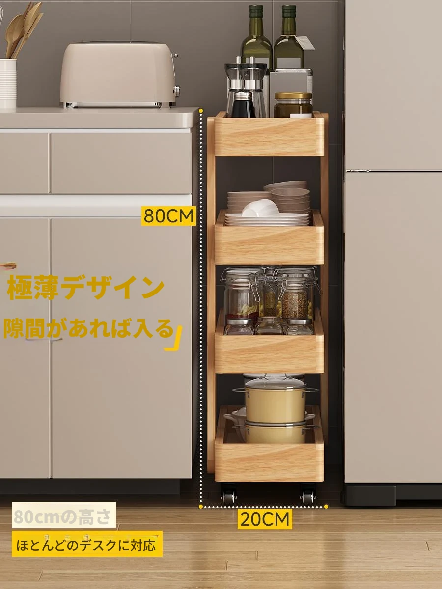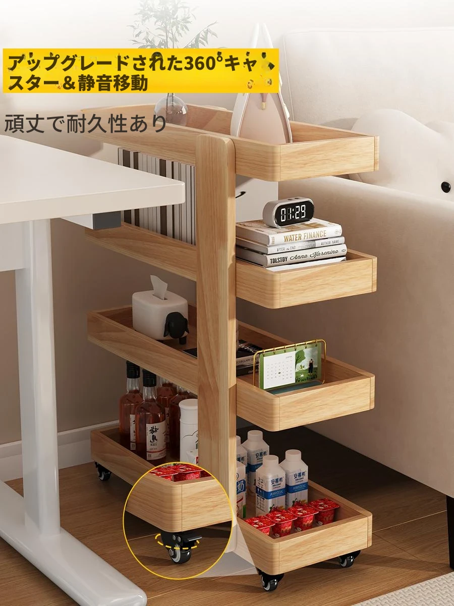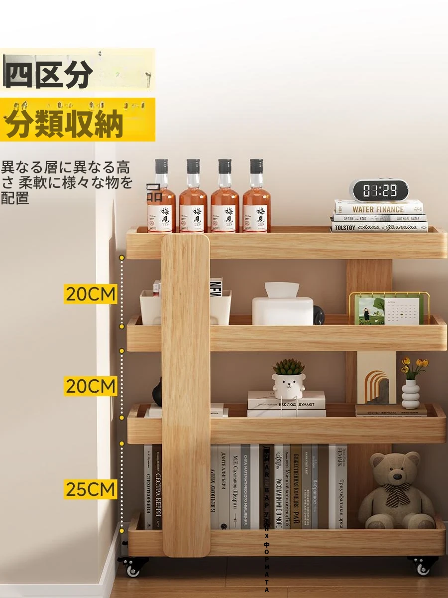 三夢のすきま収納キャスター付き本棚 - 多段階のスリムなスナックラック!移動可能なソファの収納棚、頑丈な無垢材を使用!あなたの生活空間を美しく整理整頓!