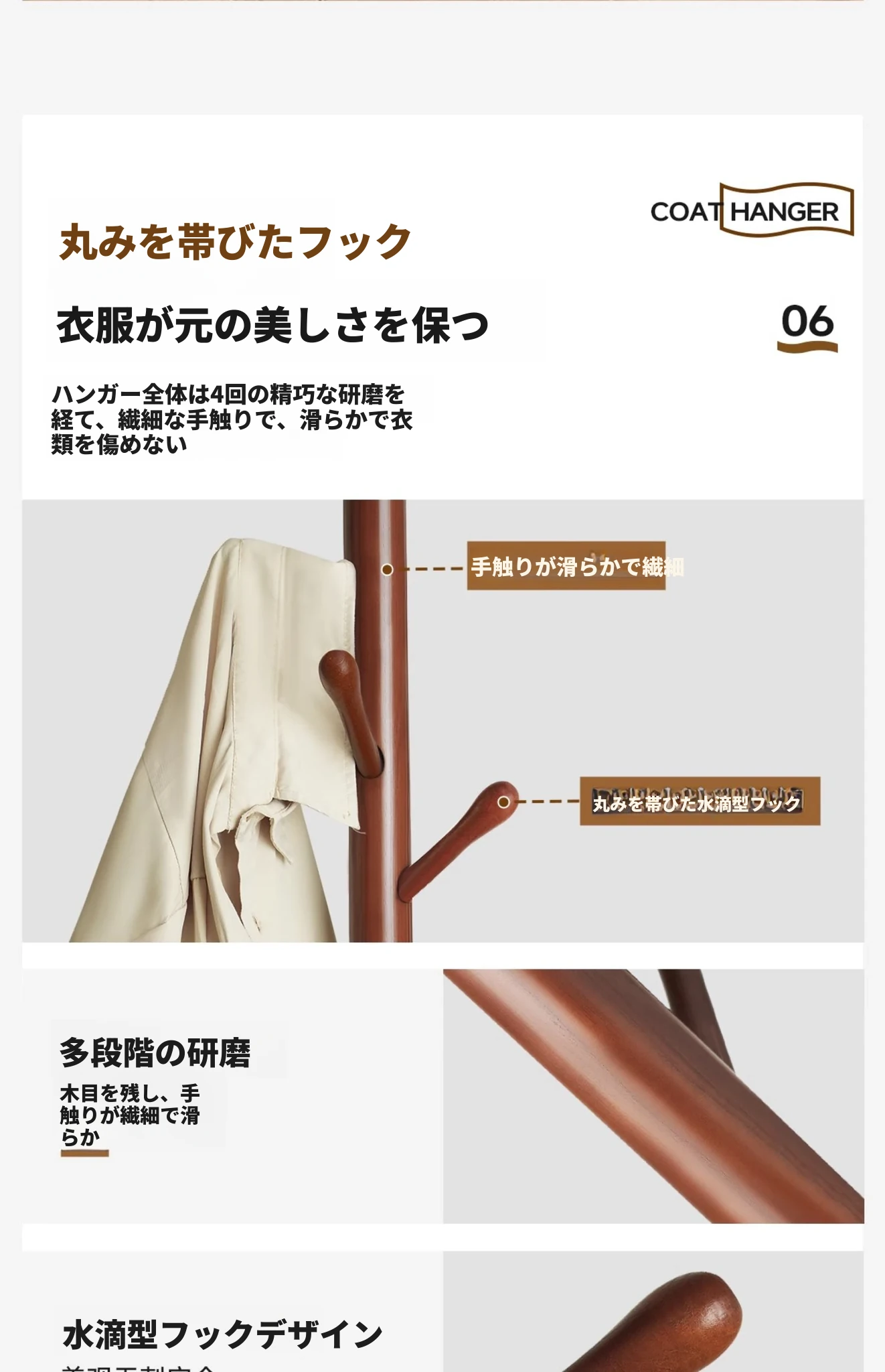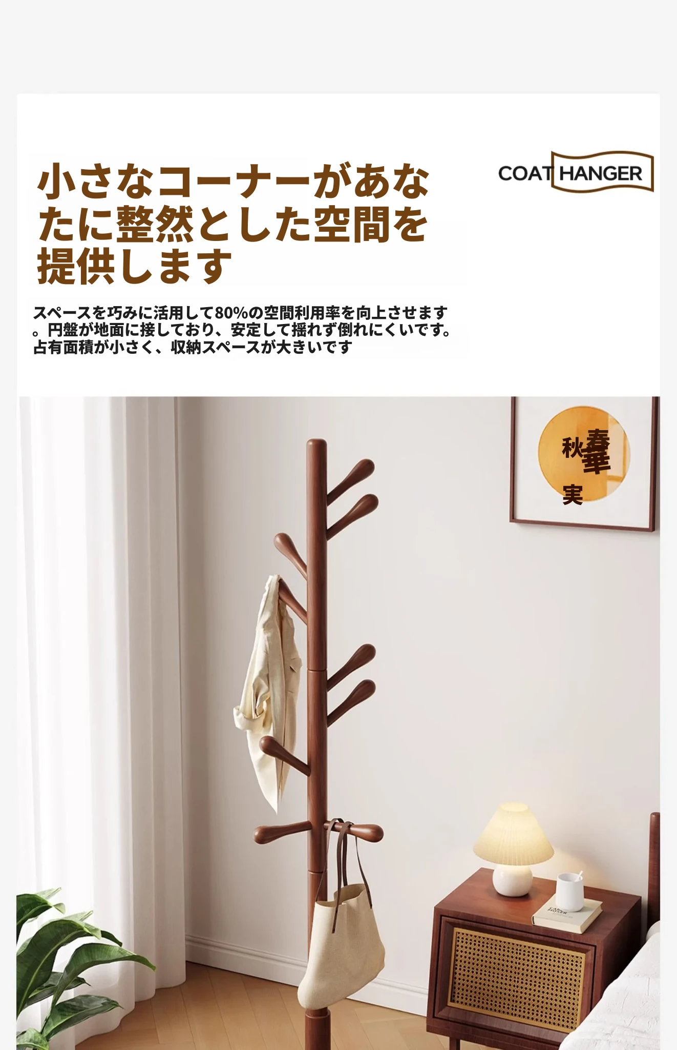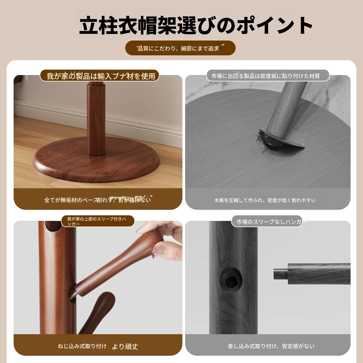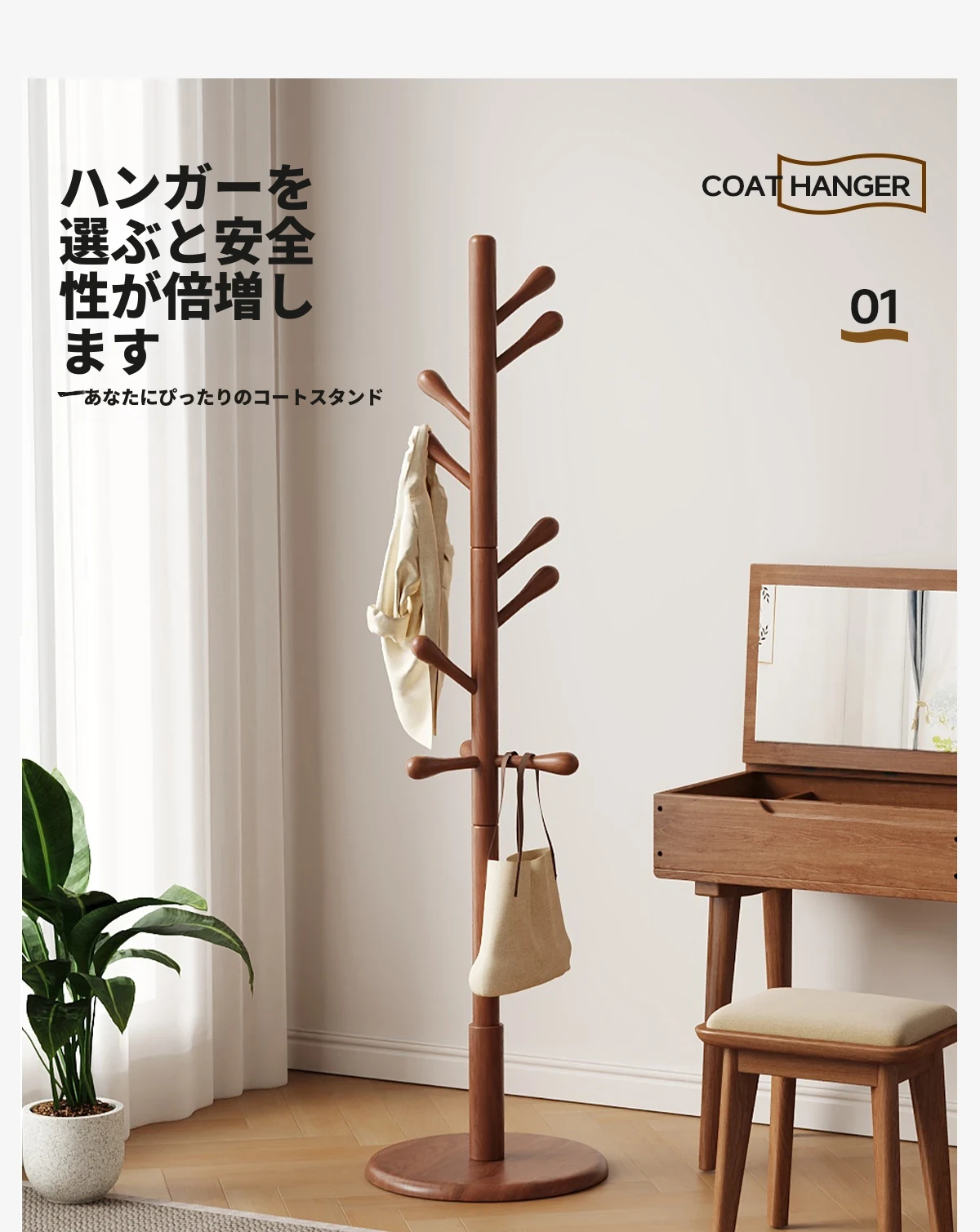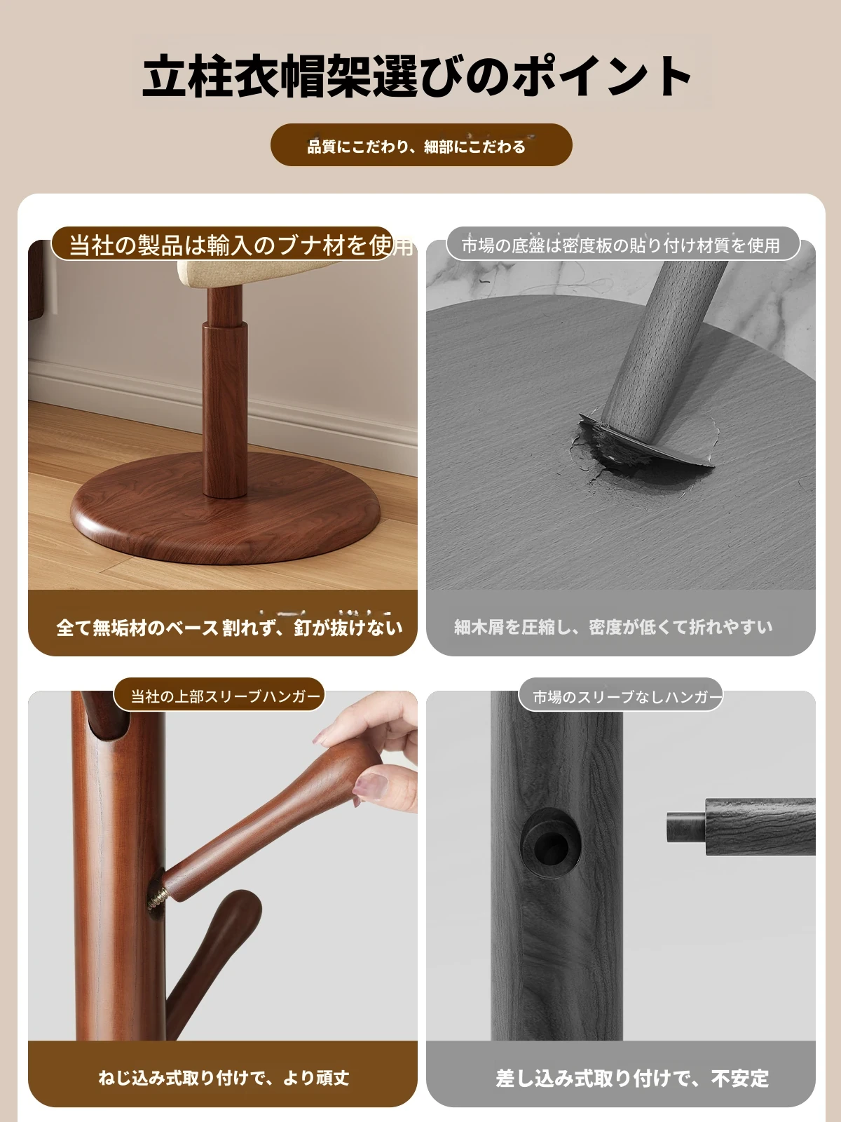 天然木製の衣類ハンガー|シンプルでスタイリッシュな立式コートラック|ベイジュウ材の高品質|寝室やリビングにぴったり|衣服やバッグをスマートに収納!
